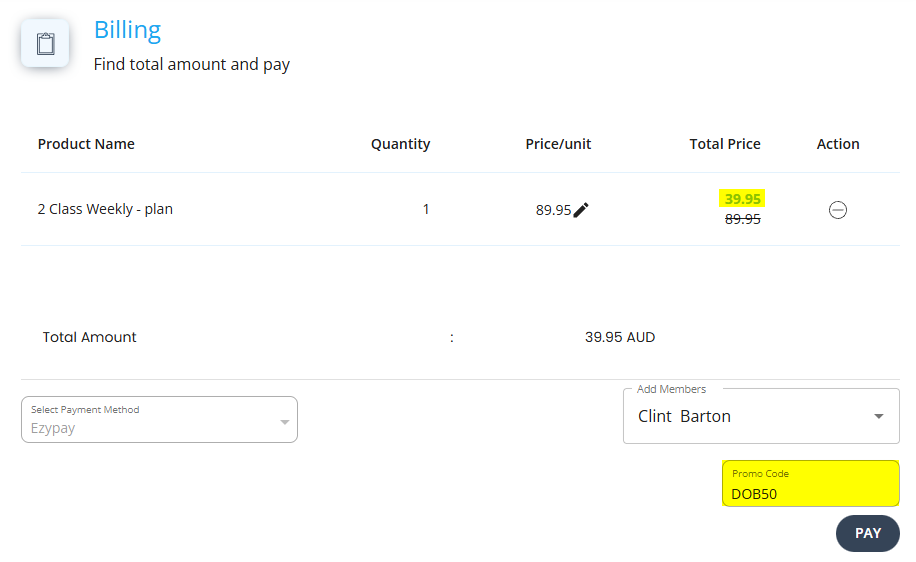 Once a member is selected, the promo code field and Pay button appear (no payment has been taken yet).