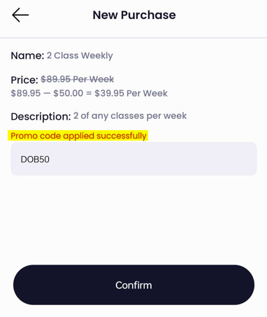 When a member purchases through the member app, the promo code is applied before the purchase is confirmed.